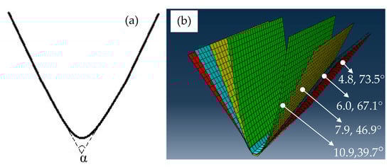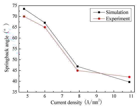 Figure 6 shows the springback angles after thrice forming by simulation and experiment. Overall, the springback angles firstly reduce obviously when the current density increases from 4.8 to 7.9 A/mm2. Then, they slightly decline with further increasing the current density. Furthermore, the simulated value is close to the measured one. The highest error is only 6%. It indicates that the two-step simulation is feasible for predicting the springback characteristics of electrically-assisted incremental forming. Nevertheless, the error mainly results from element size, thermal boundary condition, and experimental measurement. The sheet element size during the forming simulation should be refined in the radius zone, which is helpful for improving the simulation accuracy. The heat sink method is used to simplify thermal exchange between the sheet and surrounding environment. In fact, the temperature calculation error exists as shown in Figure 2, which also affects the springback angle prediction accuracy. Additionally, the two sides of the formed part are curved, which results in the measurement error of springback angle.