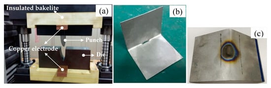 Titanium alloys are used in a wide range of industries, including aerospace, surgical implants, and fuel cells owing to their excellent properties such as moderately high specific strength, good toughness, and excellent corrosion resistance [1,2,3]. The Ti-6Al-4V (TC4) titanium alloy is most widely used in this alloy family. Due to their poor formability and large springback at room temperature, hot working technique is usually used to produce various kinds of complicated TC4 parts. However, the traditional hot forming process heated in the furnace has the disadvantages of low efficiency, high energy consumption, and complex equipment requirement. The development of advanced electrically-assisted forming (EAF) technology has been a promising method of solving the bad plasticity of titanium alloys at room temperature. It utilizes the electroplastic effects brought by the electric current flowing through metals to assist the deformation of low plasticity materials. Utilizing electric current in the forming process causes a primary benefit of rapid heating to a desired temperature for either warm or hot forming process, while averting the demand for expensive heating furnaces and long heating/cycle period [4].