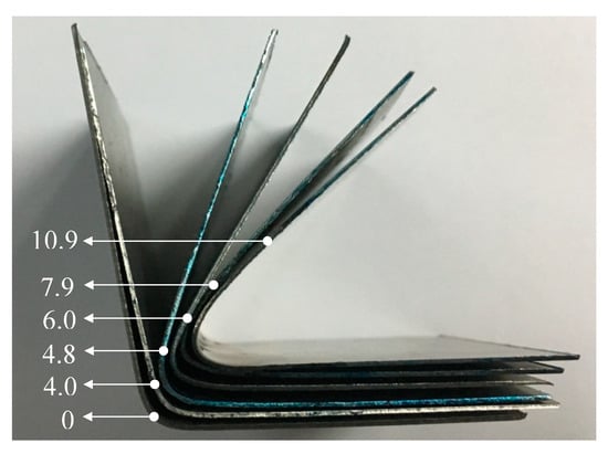 Figure 5 shows the formed parts after thrice forming at different current densities. The formed parts keep close to the ideal geometry with increasing pulse current densities, which accords to the above result. Nevertheless, it is noted that the shape of the formed part at 4.0 A/mm2 is nearly the same as that formed without the pulse current at room temperature. Additionally, the crack often happens at 4.0 A/mm2. The electroplastic effect hardly plays a role in improving the deformation ability of TC4 sheet. The springback angle prominently reduces when the current density increases to 4.8 A/mm2. Therefore, the current density threshold value maybe exists between 4 and 4.8 A/mm2 for the electroplastic effect of TC4 titanium alloy. Previous studies have highlighted a “threshold effect” whereby electrical application benefits are neglected until a critical current density is reached [14]. It was also found in copper alloy [15], 6061-T6 aluminum alloy [16], and AZ31B magnesium alloy [17]. The threshold effect maybe results from sufficient current being applied to aid dislocation motion past grain boundaries and element barriers [15].