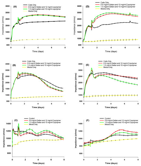 Resistance measurements with the two hydrogel formulations of confluent (A) APRE-19, (B) ppRPE, (C) 3T3 cells; and proliferating (D) ARPE-19, (E) ppRPE, and (F) 3T3/NIH cells. Values are given in mean ± SEM (n = 4).