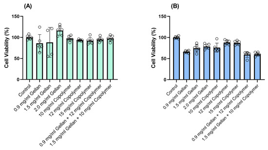 For the biocompatibility experiments, ppRPE and 3T3/NIH (fibroblasts) cells were exposed to three concentrations of gellan (0.9-1.5-2.0 mg/mL) and copolymers (10-12-15 mg/mL), respectively. Finally, we tested the biocompatibility of the two formulations of our hydrogels on both cell types for 72 h. The results indicated that the two formulations were compatible with the ppRPE cells (Figure 4A). On the other hand, these two formulations slightly decreased the viability of the 3T3/NIH (fibroblasts) cells (Figure 4B).
