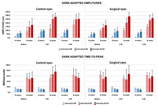 Evaluation results of electroretinography (ERG) with the time course compared to the surgical and non-surgical eye (negative control). Upper panel: dark-adapted amplitudes in both a- and b-waves. Lower panel: dark-adapted time-to-peak, both a- and b-waves. The blue bars indicate the a-wave, and the red bars indicate the b-wave. (n = 5.).