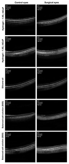The OCT imaging interpretation in Figure 6 shows no significant difference in the vitreous cavity or in the retinal layers of either the surgical or control eyes. At the four-month marker, the 1.5G_10CoP formulation shows the vitreous substitute is fully biocompatible in the Dutch belted rabbits and confirms the retina is functioning within normal limits. Additionally, there has been no evidence of retinal detachments in the OCTs.