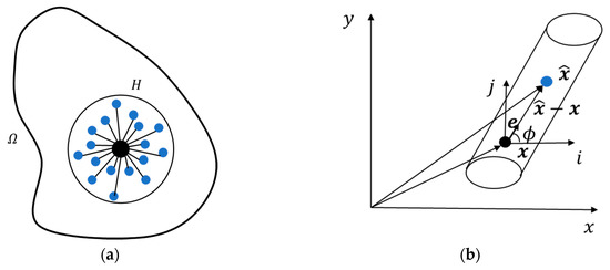 (a) The peridynamic horizon of a material point; (b) a peridynamic thermal bond between and in 2D.
