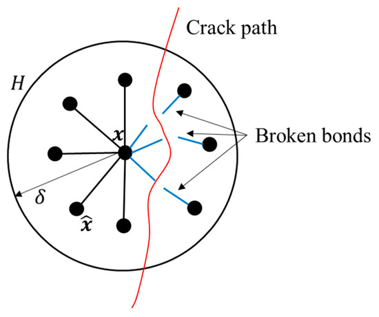 To simulate transient heat conduction for FGMs with cracks, cracks need to be modelled by PD. As shown in Figure 4, the partial t-bonds in the horizon of material point were broken. Referring to Bobaru and Duangpanya [24], the kernel function in Equation (2) is set as a “history-dependent” function:
