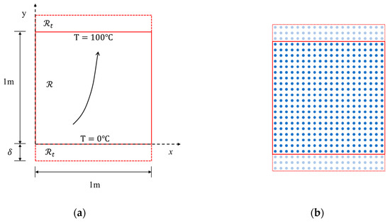 As shown in Figure 5a, the FGM plate has a length and width of 1.0 m, a thickness of 0.01 m, and an initial temperature of 0 °C. The top edge is fixed at a constant temperature of 100 °C. The bottom edge is 0 °C. The left and right edges are well insulated (zero normal flux). The geometry details and the boundary conditions are shown in Figure 5a. Figure 5b is the PD discretization model of the FGM plate.