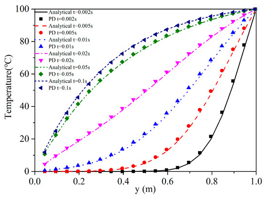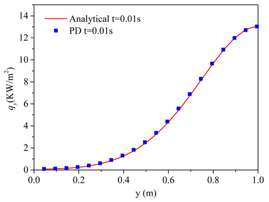 The x and y directions of the model are discretized into 100 material points, the point spacing , the horizon size , and the time step s. In Figure 6, the temperature distribution along the line x m is compared with the solution obtained by analytical method. The solution is plotted at different times: 0.002, 0.005, 0.01, 0.02, 0.05, and 0.1 s, to observe its transient heat transfer characteristics. The vertical heat flux comparison at t = 0.05 s along the line x m is plotted in Figure 7. The numerical results agree very well with the analytical solution.