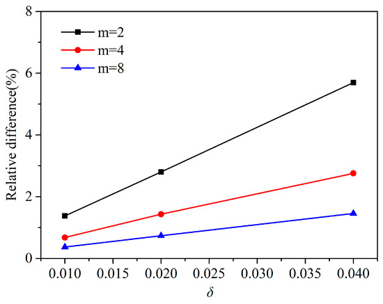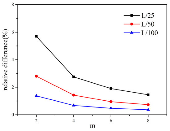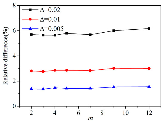 In terms of m-convergence, as shown in Figure 9, the fixed horizon is equal to 0.04, 0.02, and 0.01 m, the results show that when is constant, the relative difference tends to decrease with increasing the nonlocal ratio, . In terms of δ-convergence, the nonlocal ratio m is equal to 2, 4, and 8, it can be seen that the relative difference tends to decrease with decreasing horizon size δ in Figure 10. When δ = 0.01 m and m = 4, 8 and δ = 0.02 m and m = 8, the numerical calculation has higher precision, and the relative difference is less than 1%. Another type of m-convergence is also used for analysis, the point spacing is fixed and the nonlocal ratio m is changed. As shown in Figure 11, we analyse the m-convergence for three different point spacing: = 0.02, 0.01, and 0.005 m. The relative difference of the numerical calculation changes very little with increasing m, while the point spacing is fixed. The relative difference when m = 3 is slightly less than when m is equal to some other values. The relative difference decreases as the material point spacing decreases.