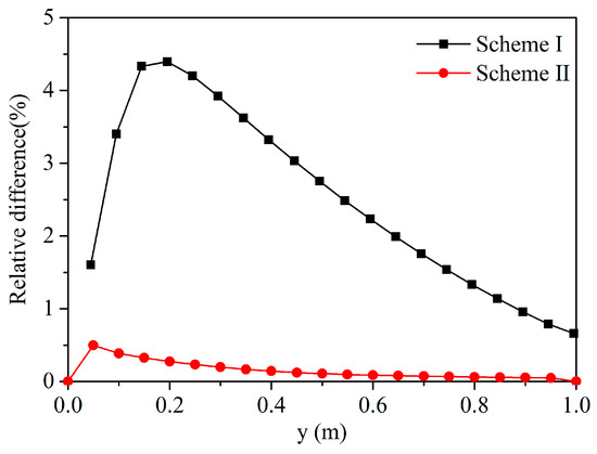 Comparison of the relative difference in temperature, between the solution of scheme Ⅱ along the line x = 0.5 and the solution of scheme Ⅰ along the line x = 0.495 m at t = 0.01 s.