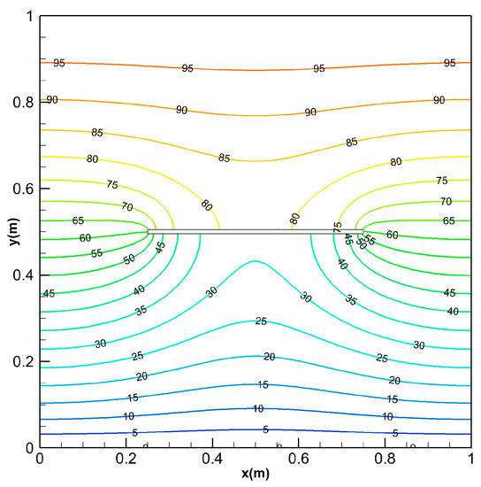 Figure 15 shows the temperature field of FEM result at t = 0.03 s. Figure 16 shows the temperature distribution of PD1 and PD2 at t = 0.03 s. At this time, the temperature in the FGM plate has not reached a steady state. It can be observed from Figure 15 and Figure 16 that the temperature contours of PD2 and FEM are almost identical. But, the temperature of PD1 at the bottom of the crack is lower than the temperature obtained by FEM. This phenomenon can also be observed by comparing the temperature results of the FGM plate along the line x = 0.5 m at t = 0.03 s (see Figure 17). The reason for the above results can be analyzed as follows. The micro-conductivity of the material points close to crack from the PD1 method is lower than the true value, which leads to a decrease in the heat transfer efficiency. Hence, our proposed PD model which considers the micro-conductivity correction of the material points close to the crack can simulate transient heat conduction of FGMs plate with insulated crack exactly.