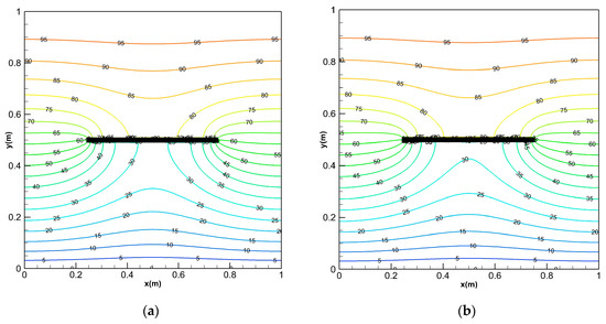 To demonstrate the advantage of PD, we consider the problem of transient heat conduction of the FGM plate with a horizontal dynamic crack. The growth of the crack is imposed by us here. As shown in Figure 18, consider the pre-existing adiabatic horizontal crack in the middle of the FGM plate. The initial length of the crack is 0.1 m. The crack can be dynamically extended along the x direction. The rate of 80 m/s is extended to both sides, and the final crack length is 0.5 m at t = 0.05 s. The material parameters of the FGM plate are the same as example 1. The geometry details and the boundary conditions are the same as the first example. It is assumed that the extended crack can cut the heat conduction of the t-bond passing through the crack and we consider the micro-conductivity correction of the material points close to crack introduced in Section 3.4.