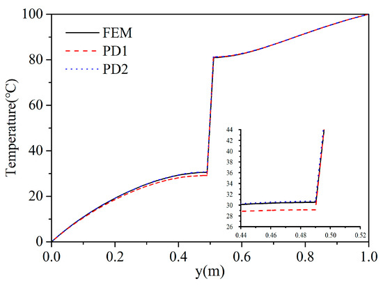 Temperature comparison along the line x = 0.5 m at t = 0.03 s from FEM, PD1 and PD2.