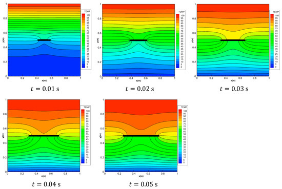 The temperature distributions at different times for three values of the exponential parameter are shown in Figure 21, Figure 22, Figure 23 and Figure 24. The steady-state results are given at t = 5 s. As the cracks grow and the crack gap closes, the temperature rises above the V-shaped crack and drops below it. Once the cracks intersect with each other and continue to grow, the temperature values jump around the intersection point of x-like crack in FGM plate. Before the steady state is reached, the temperature difference between the top and bottom of the intersection point increases with the calculation time. When 0, the material becomes homogeneous and the temperature is symmetrically up and down when t = 5 s.