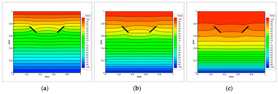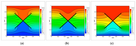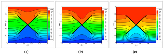 Temperature distribution on FGMs plate with dynamic intersecting cracks for (a) , (b) and (c) at t = 0.5 s.