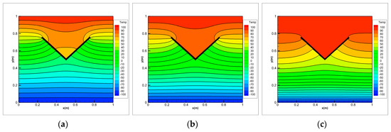 Temperature distribution on FGMs plate with dynamic intersecting cracks for (a) , (b) and (c) at t = 1.25 s.