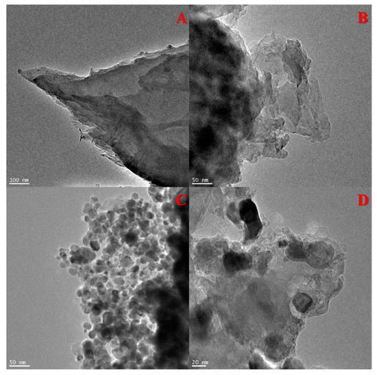 The morphologies of g-C3N4, ex-g-C3N4 and ex-g-C3N4-NixOy were studied by transmission electron microscopy. The TEM images of the samples are presented in Figure 1. TEM images of g-C3N4 and ex-g-C3N4 (Figure 1A,B) show a visible difference in the thickness of these two samples. Figure 1C and D exhibit that NixOy nanoparticles were successfully deposited on the flakes of ex-g-C3N4 (ex-g-C3N4-NixOy). The average diameter of NixOy particles is ~32 nm.