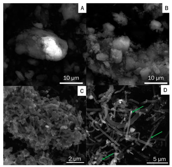 Figure 3 shows SEM images of g-C3N4, ex-g-C3N4 and the sample produced in the process of hydrogen reduction of ex-g-C3N4-NixOy and next CVD in ethylene in the presence of reduced ex-g-C3N4-NixOy (CNT-N). g-C3N4 and ex-g-C3N4 (Figure 3A,B) exhibited aggregated morphology with irregular multiple-layered structures. The morphology of CNT-N (Figure 3C,D) is quite different from that of g-C3N4 and ex-g-C3N4. This sample is composed of nanotubular structures. Moreover, nickel residues which served as catalysts in nanotube growth were observed inside the tubes (green arrows in Figure 3D). The obtained nanotubes tend to agglomerate into larger clusters. The reference experiment without ethylene was also performed (Figure 4). This confirmed that ethylene is crucial in the process of nitrogen-doped carbon nanotube formation.