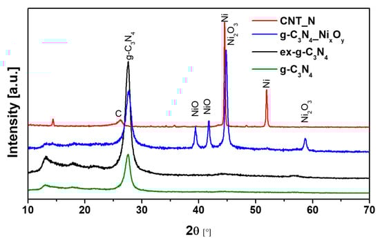 XRD patterns of g-C3N4, ex-g-C3N4, ex-g-C3N4-NixOy and CNT-N samples are shown in Figure 8. The peaks located at 13.1° and 27.56° can be observed for three samples (g-C3N4, ex-g-C3N4, ex-g-C3N4-NixOy) and they are attributed to the presence of graphitic carbon nitride. Peaks at 13.1° and 27.56° correspond to the (100) and (002) crystalline phase, respectively (JCPDS 87–1526). Nickel-functionalized graphitic carbon nitride (ex-g-C3N4-NixOy) exhibits the presence of different forms of a nickel compound. The diffraction peak at 2θ 44.8° and 58.7° is related to the nickel (III) oxide (JCPDS 14–0481), while two peaks at ~39.4° and ~41.8° belong to nickel (II) oxide (JCPDS 85–1977) [36,37]. During the last stage of CNT-N synthesis, nickel oxide is reduced to the metallic form of nickel and catalyzes the growth of nanotubes. This is confirmed by the disappearance of the peaks from NiO and Ni2O3 and the appearance of signals characteristic for the metallic form of nickel located at ~44.5° and ~51.9° (JCPDS 87–0712) [38]. Moreover, the diffraction peak at 26.2° observed for CNT-N is assigned to the (002) plane of graphitic carbon.