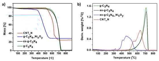 Additionally, TGA analysis performed in argon atmosphere was conducted. Thermogravimetric (TG) (Figure 9a) and derivative thermogravimetric (DTG) (Figure 9b) curves of g-C3N4, ex-g-C3N4, ex-g-C3N4-NixOy and CNT-N heat-treated under argon flow are presented in Figure 10. g-C3N4 and ex-g-C3N4 are stable up to ~500 °C, either in air or argon atmosphere (see Figure 9 and Figure 10). This means that both g-C3N4 and ex-g-C3N4 can endure high temperatures, even in an oxidizing atmosphere. The weight loss at above 500 °C is not due to the oxidation by O2, but to the direct thermal decomposition of g-C3N4 itself [39]. Moreover, the residual mass of ~3 wt% is observed in an inert atmosphere. ex-g-C3N4-NixOy exhibited different thermal stability in air and argon atmosphere, which was higher in Ar flow. Furthermore, the residual mass after analysis is ~34 wt% (~24.8 wt% in air). The obtained CNT-N is stable in argon atmosphere.