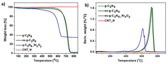 Thermogravimetric analysis was carried out in order to determine the thermal properties of the samples. Figure 9 represents the TG (a) and DTG (b) curves of g-C3N4, ex-g-C3N4, ex-g-C3N4-NixOy and CNT-N heat-treated under air flow. Here, the exfoliation process does not affect the thermal stability of graphitic carbon nitride. For both g-C3N4 and ex-g-C3N4, the degradation process starts at about 500 °C and continues until complete decomposition. Functionalization with nickel oxides (ex-g-C3N4-NixOy) significantly decreased the decomposition temperature to 350 °C. The residue mass after the analysis is ~28.7 wt% and this value is assigned to the amount of nickel compounds in the sample. Two steps can be distinguished on the TGA curve obtained for the CNT-N sample. The first one begins at a temperature of 468 °C and is attributed to the removal of more defected carbon structures. The second one, from a temperature of 565 °C, is related to the degradation of carbon nanotubes. The residual mass is ~24.8 wt% which is the nickel compounds content in the sample.
