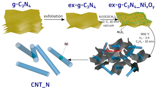Here, nitrogen-doped carbon nanotubes (CNT-N) were synthesized using exfoliated graphitic carbon nitride functionalized with nickel oxides (ex-g-C3N4-NixOy). CNT-N were produced at 900 °C in two steps: (1) ex-g-C3N4-NixOy reduction with hydrogen and (2) ethylene assisted chemical vapor deposition (CVD). The detailed characterization of the produced materials was performed via atomic force microscopy (AFM), transmission electron microscopy (TEM), Raman spectroscopy, X-ray diffraction (XRD) and thermogravimetric analysis (TGA). The possible mechanism of nanotubes formation is also proposed.