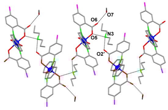A small portion of the pseudo zig-zag chains formed through the H-bonding interactions (dashed lines) between the Pr2NH2+ counterions, the lattice MeOH molecules, and the carboxylate O atoms of sacb2− in the crystal structure of 1∙MeOH. H atoms are omitted for clarity. Color scheme as in Figure 1.