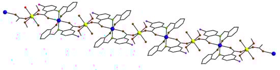 All manipulations were performed under aerobic conditions, using materials (reagent grade) and solvents as received unless otherwise noted. The Schiff base ligand sacbH2 was prepared, purified, and characterized as described elsewhere [20,21]. Infrared spectra were recorded in the solid state on a Bruker’s FT-IR spectrometer (ALPHA’s Platinum ATR single reflection) in the 4000–400 cm−1 range. Elemental analyses (C, H, and N) were performed on a Perkin-Elmer 2400 Series II Analyzer. Variable-temperature magnetic susceptibility studies were performed, using an MPMS5 Quantum Design magnetometer operating at 0.03 T in the 300–2.0 K range. Diamagnetic corrections were applied to the observed paramagnetic susceptibility, using Pascal’s constants [22].