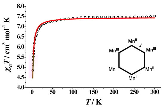 To evaluate the intrachain exchange coupling constant in 2, the system was treated as a simplified six-spin model, comprising a closed ring of alternating MnII∙∙∙MnIII paramagnetic ions (inset of Figure 6). Similar magnetic models have been used for the simulation of the susceptibility data of various 1-D chains [44,45]. The χΜT versus T data were fitted (red line in Figure 6) to the spin Hamiltonian given by Equation (3), where J coupling constant represents the interaction between adjacent S1,3,5 = 5/2 (for MnII) and S2,4,6 = 2 (for MnIII) spin carriers.