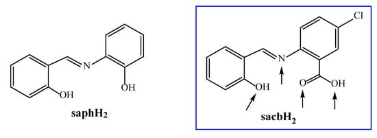 Structural formulae and abbreviations of the Schiff base ligands discussed in the text; the blue box encloses the tetradentate ligand sacbH2 used in the present work, whereas the arrows indicate the potential donor atoms.
