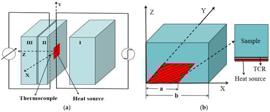 The measurement model with consideration of the effect of the TCR between the heating element and measured sample was established on the basis of our previously proposed small-plane heat source method, and the schematic is shown in Figure 1. As shown in Figure 1a, a plane source element with a side length of 2a was located between two samples with the same side length of 2b, i.e., samples I and II, and used as a heat source. The temperature increase at the measuring points was determined using a thermocouple with fine wires (d = 0.05 mm). Figure 1b shows the computational domain in the model and three spatial dimensions.