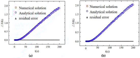 Figure 2 shows the comparative results between the numerical and analytical solutions for isotropic (see Figure 2a) and anisotropic (see Figure 2b) materials at the measuring point (0,0,0.005). The maximum deviation in the temperature increase for the two materials was less than 1.6%, indicating the correctness of the analytical solution in this study.