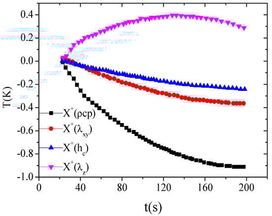 Firstly, the sensitivity analysis was carried out and the sensitivity coefficients were calculated as follows to relate the magnitude of the thermal parameters to the change in the temperature increase at the measuring point. The sensitivity coefficient for the cross-plane thermal conductivity was obtained by , where represents the sensitivity coefficient of an estimated parameter (i.e., , or , or , or ) to the temperature . These coefficients were also used in the inverse problem solving to identify the parameters. Using the values listed in Table 1, the results of sensitivity coefficients calculation for the estimated thermophysical parameters and TCC are shown in Figure 3.
