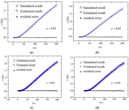 Then, an improved Gauss–Newton algorithm was developed to simultaneously obtain four estimated parameters [] by the least squares analysis in which the sum of the square errors between the calculated and experimental results of the temperature increase of the measuring point in the sample was minimized. A series of simulation experiments were performed to verify the correctness of the method for estimating multiple parameters and the stability of the estimation results. The temperature signal obtained by the analytical solution was added with different random noises to be used as the experimental measurement data. The signal can be expressed as , where is the value of random error, is the temperature increase obtained by the analytical solution at the measuring point, and rand is used to generate random matrices. In the simulation experiments, the in-plane and cross-plane thermal conductivities of the anisotropic materials were set to 0.4 W∙m−1·K−1 and 0.2 W∙m−1·K−1, and the volumetric heat capacity was set to 1,500,000 J∙m−3·K−1. The values of other parameters were the same as those listed in Table 1 for the isotropic materials. Figure 4 shows the comparison of the increase in temperature between the simulated and estimated results as well as the residual errors for isotropic and anisotropic materials.