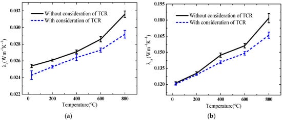 It was indicated that an increase in temperature led to an increase in thermal conductivities, volumetric heat capacity, and TCC. The cross-plane and in-plane thermal conductivities and volumetric heat capacity increased by 20.2%, 37.9%, and 12.3% when the temperature increased to 800 °C compared with those at 28 °C, respectively. The TCC of the material also increased by 21.7%. This result indicated that the thermophysical parameters of the material and the TCR of the measurement system might greatly change with the temperature. The change in the in-plane thermal conductivity was larger than that in the cross-plane thermal conductivity. The thermal conductivities measured by the method with the effect of the TCR were less than those obtained by the method without the TCR. The maximal deviation was 8.21% when the TCC between the sample and the heating element was 125.1 W·m−1·K−1, because the increase in the temperature of the sample calculated by the mathematical model of the measurement system would be larger than that measured by the experimental measurement if the TCR was not considered. Hence, leading the measured value of the thermal conductivities estimated using the experimental data was larger than the desired value. In addition, the in-plane thermal conductivity showed higher difference between the TCR consideration and without the TCR consideration as the temperature increased. A possible reason might be that the change with temperature in the in-plane thermal conductivity was larger than that in the cross-plane thermal conductivity, and, correspondingly, the thermal resistance in the in-plane direction was relatively smaller. Subsequently, the effect of the TCR on the heat transfer in the in-plane direction was larger than that in the cross-plane direction in response to increasing temperature.