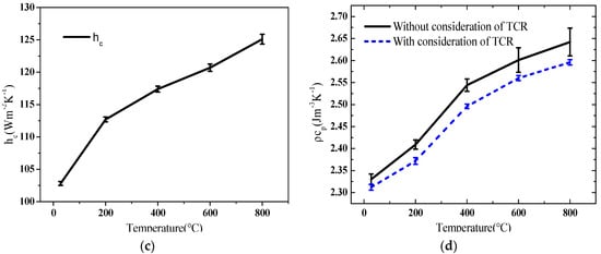 The thermophysical parameters and the TCCs of an anisotropic high-temperature-resistant material (Sample D, silica aerogel material) with a large difference in its in-plane and cross-plane thermal conductivities were experimentally measured at room and high temperatures by using the proposed method. For comparison, the same thermophysical parameters of the same sample were measured using the small-plane heat source method without the effect of TCR which was reported in our previous work []. The corresponding changes with the increase in temperature are shown in Figure 6.