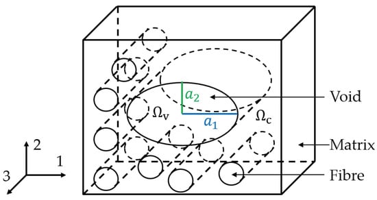 Composite materials consist of fibers in a matrix phase containing voids. The fiber direction is defined as “3” direction and the transverse directions are known as “1” direction (in the lamina plane) and “2” direction in the thickness direction. Voids show a much larger dimension in fiber direction compared to the other directions [4,31]. Therefore, the voids are modelled as cylinders with infinite “3” axis but different semi-axes in “1” and “2” directions. For the scope of the research presented, the void semi-axes are aligned to the “1” and “2” directions. The domain within the void is called “void domain ()” and the region outside the void is called “composite domain ()” (Figure 1). All properties regarding the composite domain or the void domain are indexed with “c” or “v”.