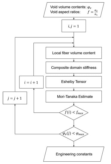 The method evaluates the resulting engineering constants for different volume contents and aspect ratios of the cylindrical voids with elliptic base for a global fiber volume content of . The process is assumed to be an RTM process, in which the adjusted fiber volume content changes. The void volume content was varied in ten steps in the interval of to in the first homogenization step to calculate with Equations (1)–(9) the resulting properties of the composite domain. Then Equation (17) was applied to calculate the engineering constants of the composite and the void domain. The aspect ratio was varied in ten steps in the interval . Both homogenization steps were implemented to the software Matlab, TheMathworks, USA. The flow chart of the implemented scheme is shown in Figure 2.