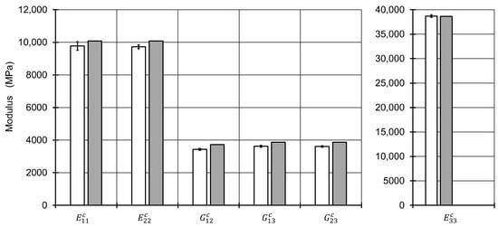 Resulting moduli of the first homogenization step calculated via the RVE microstructures (white bars) and via the used mixing rules (gray bars).