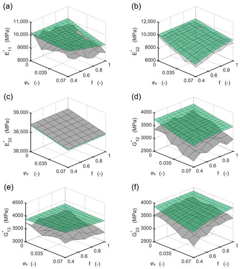Resulting moduli calculated with the FEM RVE (gray surface) compared to the moduli calculated with the method presented (green surface): (a) transverse Young’s modulus “1” direction; (b) transverse Young’s modulus “2” direction; (c) fiber parallel Young’s modulus “3” direction; (d) transverse shear modulus; (e) in plane shear modulus; (f) out of plane shear modulus.
