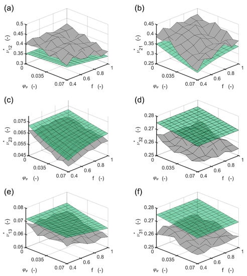 Resulting Poisson numbers calculated with the FEM RVE (gray surface) compared to the Poisson numbers calculated with the method presented (green surface): (a) transverse Poisson number for tension in “1” and reaction in “2” direction; (b) transverse Poisson number for tension in “2” and reaction in “1” direction; (c) minor out of plane Poisson number; (d) major out of plane Poisson number; (e) minor in plane Poisson number; (f) major in plane Poisson number.
