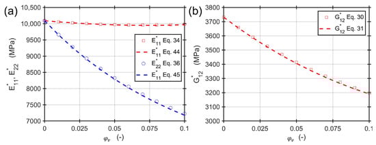 The approximate Equations (31), (44), and (45) for an aspect ratio of and a fiber volume content of in the range of and of void volume content are compared to the exact solutions of Equations (30), (34), and (36). The materials are the same as in the previous section. Figure 8 shows an excellent agreement of both calculation approaches under the assumptions made. The approximate solutions allow for a simple and straightforward way to estimate the engineering constants for a composite material containing voids of different aspect ratios and volume contents.
