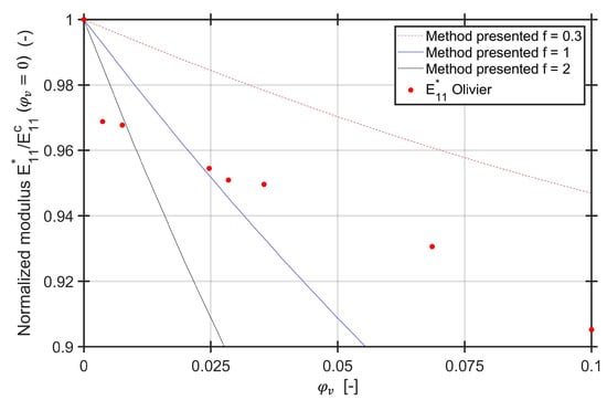 Since the modulus of the composite domain is calculated with the adjusted fiber volume content, may be a function of the void content. As discussed in Section 2.1, depends on the manufacturing process. Introducing the definition of the adjusted fiber volume content into Equation (22) and the mixing rule from Equation (2) results in: