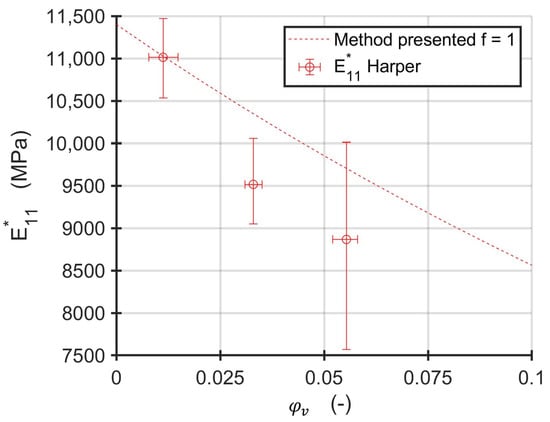 Harper et al. investigated the influence of voids on the mechanical properties of AS4/3502 carbon fiber-reinforced epoxy pre-preg [45]. They used unidirectional specimens with void contents ranging from and to measure Young’s moduli in fiber parallel and fiber perpendicular direction as well as the in-plane shear modulus and major in-plane Poisson number. However, results are only plotted for void contents higher than . Since different void contents were achieved by different pressure profiles in an autoclave process and no values are reported, the formula for an unchanged adjusted fiber volume content is applied. The shape of the void was also not investigated. Therefore, the voids are assumed as cylindrical with circular basis (). Since the modulus is reported as absolute value, the first micromechanical homogenization step is omitted and a void free modulus of 11,400 MPa is assumed. Material parameters for the AS4 fibers differ significantly through literature [43,46,47]. The results of the shear modulus clearly disagree with other results reported [43,48]. Therefore, only the modulus is compared to the results of the method presented.