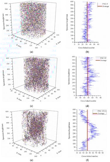 Cross-linked number of interconnected pores along the specimen height direction. (a) Cross-linked number spatial distribution of PAC-5; (b) Cross-linked number of PAC-5 along the specimen height direction. (c) Cross-linked number of the spatial distribution of PAC-10; (d) Cross-linked number of PAC-10 along the specimen height direction; (e) Cross-linked number of the spatial distribution of PAC-13(1); (f) Cross-linked number of PAC-13(1) along the specimen height direction; (g) Cross-linked number of the spatial distribution of PAC-13(2); (h) Cross-linked number of PAC-13(2) along the specimen height direction (i) Cross-linked number spatial distribution of PAC-13(3); (j) Cross-linked number of PAC-13(3) along the specimen height direction.