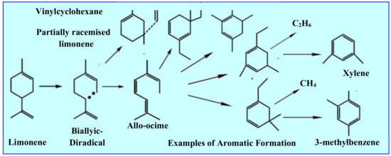 Mechanism of secondary limonene conversion (thermal degradation) into other aromatic derivatives of BTX (benzene, toluene, xylene). [23].