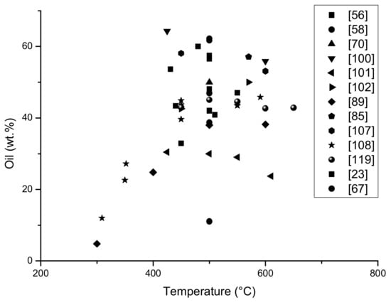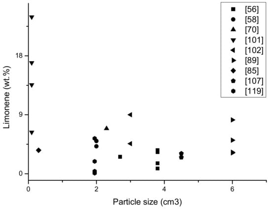 Vacuum pyrolysis yields of oil from different feedstocks, e.g., car or truck tyres with or without a silica filler, and the mass balances for the experiments were: 56% (H18, p = 10 kPa, t = 550 °C), 45% (H20, p = 7 kPa, t = 520 °C), 47% (H21, p = 7 kPa, t = 500 °C) and 43% (H22, p = 6 kPa, t = 483 °C) [59]. These results are not listed in Table 1 because they are not directly related to limonene yield.