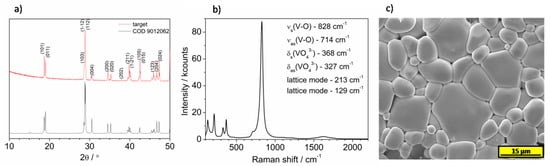 (a) The comparison of XRD patterns of target and reference pattern of BiVO4 (from crystallography open database 9012062). (b) The Raman spectrum of BiVO4 target. (c) SEM micrograph of annealed BiVO4 target.