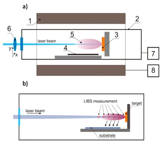 (a) Scheme of the pulsed laser deposition technique (PLD) setup: (1) heating chamber, (2) quartz process chamber, (3) target, (4) substrate, (5) laser ablation plume, (6) focusing lens mounted on xy stage, (7) pressure and process gas-composition control-unit, and (8) temperature controller. (b) Scheme of the pulsed laser deposition zone with marked positions for laser-induced breakdown spectroscopy (LIBS) measurements.