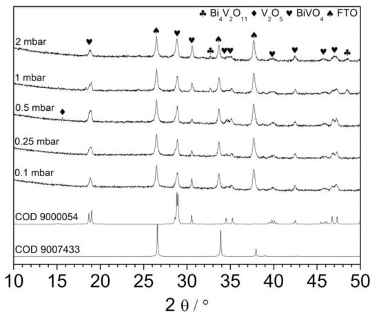 The prepared films were characterized using an XRD technique. As it is shown in Figure 3, all patterns exhibits typical reflection characteristic for monoclinic bismuth vanadate. Recently, it was reported that deposition temperature significantly affects the orientation of BiVO4 crystallites growing on the FTO substrates []. Authors showed that oxygen pressure does not change significantly the crystal structure of resulting layers. Indeed, the presented diffractograms differ rather slightly. Differences may result i.a. from the different thicknesses of the layers and the relative intensity of peaks coming from the FTO substrate. Patterns consist of all the reflexes characteristic for the monoclinic BiVO4 phase. However, in the case of the sample deposited under 0.5 mbar, reflex at about 15.5° was detected (V). It could be related to the (002) plane of BiVO4 suggesting anisotropic growth of the crystallites, but the intensity of the peak recorded at 30.5° coming from (004) plane was not enhanced. Thus, it is very likely that it is coming from V2O5 (020) plane []. The exemplary XRD pattern recorded in a small-angle scattering mode is shown in Figure S3 for the samples deposited at 0.1, 0.5, and 2 mbar. The patterns are characterized by a much lower intensity of reflections from the FTO substrate as expected. Generally, the same reflexes have been recorded as in the case of conventional XRD analysis. However, the reflection coming from V2O5 (010) plane at 20.4° was clearly detected for the sample deposited under 0.5 mbar. It confirms that the V2O5 phase was present rather on the top of the thin film. Interestingly, the peak from a plane (200) (15.5°) was not detected, in contrast to the conventional XRD measurements. It may suggest a very specific arrangement of V2O5 crystallites. Additionally, the XRD patterns of samples deposited under 1 and 2 mbar consisted of peaks at 32.5° and 48.5° suggesting the coexistence of the Bi4V2O11 (bismuth vanadate with Bi:V ratio 2:1), see Figure 3. Thus, the oxygen pressure in the deposition chamber affects the composition of resulting films. Such a conclusion was already formulated previously. However, the Bi4V2O11 phase crystallized at low O2 pressure (unlike in this work), while the application of higher pressure in the deposition chamber led to the formation of pure BiVO4 []. The differences may result from (i) different substrates and (ii) different geometry of the deposition system. The crystallite size of the films was estimated on the basis of broadening of the XRD reflections. The crystallite size in (101) direction estimated from (101) reflection observed at 18.8° was between 30 and 40 nm. The largest crystallites were observed in the sample obtained at 0.1 mbar, whereas the crystallite size values in the other films were similar (0.25–2 mbar). On the other hand, the reflection at 28.8° corresponding to the (103) and (112) planes was narrower, the crystallite sizes were between 55 and 65 nm. Additionally, in this case, low oxygen partial pressure lead to the formation of larger crystallites.