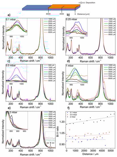 Samples have been investigated using the Raman spectroscopy technique. The films showed inhomogeneity and spectra vary depending on the measurement spot distance from the edge of the sample. Thus, the spectra were measured every 500 μm from the edge that was the closest to the target during sputtering. Only in the case of the sample deposited under 0.1 mbar pressure, the film is homogenous, and exemplary spectra are presented in Figure 4a. However, besides bands coming from BiVO4, which are characterized by enhanced intensity due to the Raman resonance effect, the new low intensity bands are seen in the Raman spectra at 145, 284, 304, 404, 481, 528, and 995 cm−1. All these bands confirm the presence of V2O5. Interestingly, V2O5 was not registered on this sample using the XRD measurement, suggesting only short-range ordering in V2O5 or too small of an amount of it on the sample. Thus, the proposed method of deposition using PLD at certain O2 pressure leads to the formation of BiVO4/V2O5 heterojunction on the whole considered surface. The Raman spectra of the film deposited at higher oxygen pressure (0.25 mbar) are presented in Figure 4b. It can be concluded that V2O5 was not evenly distributed throughout the film. The highest intensity of the band coming from V2O5 (995 cm−1) was detected 1000–2500 μm from the edge. In the further part of the layer, V2O5 does not occur and only bands originating from BiVO4 were detected. Samples obtained at pressure 0.5 mbar exhibited a similar distribution of V2O5 on the surface, see Figure 4c. The spectra recorded on the spots between 3000 and 6000 μm from the sample edge were characteristic for the pure BiVO4 phase. Additionally, the spectrum measured at the opposite site of the layer exhibited a new feature (7000–8000 μm). The bands of BiVO4 merged and a new band at about 870 cm−1 appeared. In the case of the sample deposited under 1 mbar the effect of peaks merging was enhanced and visible over a larger area of the sample (5000–8000 μm), while maintaining the presence of V2O5 on the opposite site of the layer (1000–3000 μm), see Figure 4d. Notably, two phenomena do not coexist on any of the same spots of the sample and there is a “buffer layer” containing only BiVO4 (3000–5000 μm). In the case of the sample deposited at 2 mbar, the V2O5 was not detected, see Figure 4e. The spectra collected closest to the edge of the sample (0–4000 μm) consisted of bands characteristic only of BiVO4. However, spectra change with distance from the sample edge and new bands at 247 and 567 cm−1 appear. Additionally, the two bands characteristic of V–O stretching vibration (800–900 cm−1 range) were clearly separated. Thus, depending on the pressure of oxygen in the deposition chamber, the composition of resulting films varied. For the low oxygen pressure, the effect of V2O5 formation was enhanced. The V2O5 peaks appeared closer to the sample edge that was closest to the target during deposition. In the case of higher pressures, the V2O5 disappeared and the opposite side of the sample contains a new phase that can be described as Bi-rich bismuth vanadate—Bi4V2O11. The results obtained suggest that ablation performed using UV laser leads to the generation of plasma plume where Bi and V atoms/ions can be separated. The oxygen pressure may strongly affect V atoms/ions in plasma plume, but heavier Bi atoms/ions were not significantly slowed down due to interactions with oxygen molecules in the deposition chamber. As a result, depending on the oxygen pressure, the V-rich phase (V2O5) can be formed on the one side of the sample, while the Bi-rich phase (Bi4V2O11) on the opposite. The effect of nonstoichiometric plasma plume propagation due to the differences of cations masses has been already reported for pulsed laser deposition of LaAlO3 and LaGaO3 [,]. It was also reported on the basis on Langmuir probe measurements that lighter Cu+ ions are more efficiently slowed down by collisions with oxygen molecules than heavier Ba+ and Y+ ions during deposition of YBa2Cu3O7 []. EDX (energy-dispersive X-ray spectroscopy) scans were performed in order to study the Bi:V atomic ratio along the layer. The results for layers obtained under 0.1, 0.5, and 2 mbar are presented in Figure 4f. The spectra were measured point by point, approximately every 350 μm. The spread of results was relatively large, mainly due to irregularly occurring V2O5 crystallites, however the general relationship was clearly seen. The Bi:V ratio was close to one and more or less constant for films deposited at low pressures suggesting presence of BiVO4 phase. The Bi:V ratio lower than one confirmed the presence of the V2O5 phase. Higher pressure in the deposition chamber results in a compositional gradient across the layer and the Bi concentration increased (in comparison with V concentration) from the edge that was the closest to the target during deposition. EDX analysis confirmed the presence of Bi excess and formation of Bi4V2O11 for the films deposited under 2 mbar. The Bi:V ratio was not equal to 2, because two phases are present (BiVO4 and Bi4V2O11). The results obtained support the hypothesis that Bi and V atoms and ions in plasma plume can be separated due to the interactions or reaction with O2 gas, what affects the spatial distribution of elements on the deposited films.